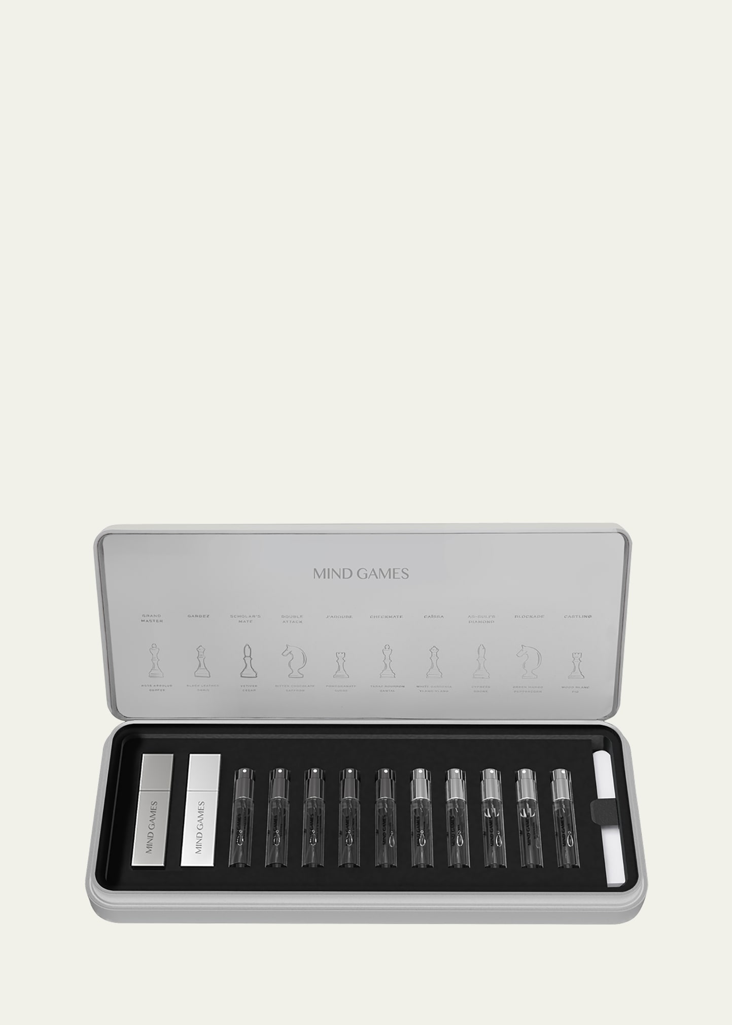 Grand Master: Rose Absolute & Coffee Gardez: Black Leather & Orris Scholar's Mate: Woody Aromatic Floral Double Attack: Citrus Woody Edible J'adoube: Pomegranate & Suede Checkmate: Tabac, Bourbon & Santal Caïssa: Floral White & Floral Woody As-Suli's Diamond: Woody Aromatic Incense Blockade: Woody Leathery Fruity Castling: Woody Floral Fruity Grand Master: Top Notes: Black Currant, Rose Water, Pivoine Middle Notes: Rose Centofolia Vitessence, Kona Co.