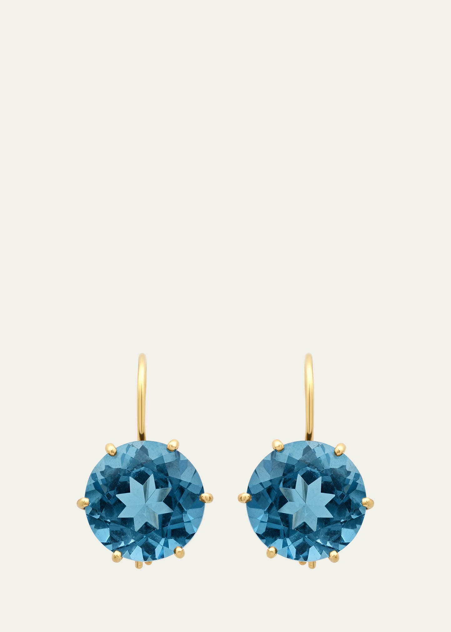 Andrea Fohrman drop earrings. Polished 18-karat yellow gold. 12mm London blue topaz. For pieced ears. Approx. 0.5"L. Made in USA.