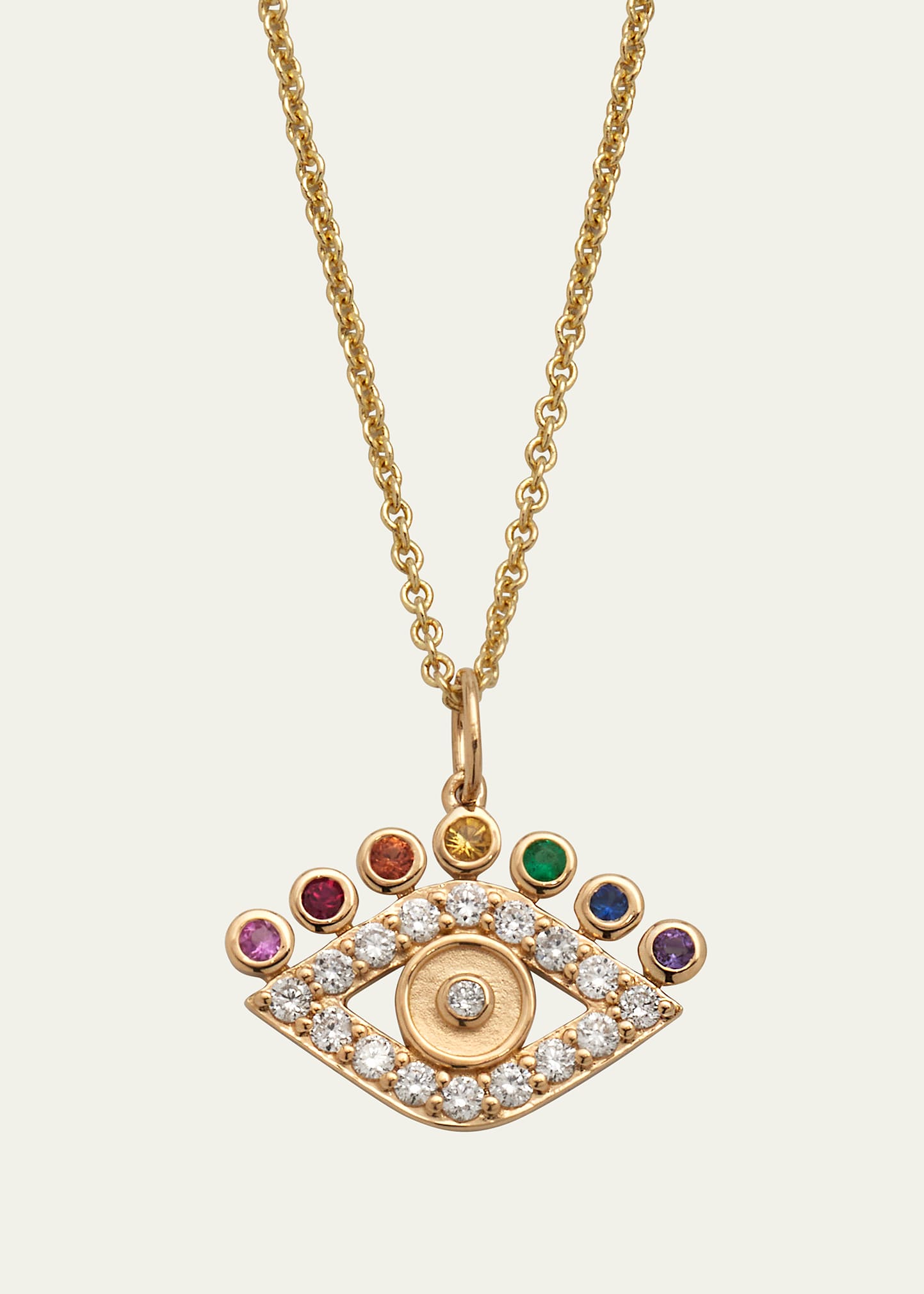 Sydney Evan charm necklace 14-karat yellow gold chain Pink, orange, blue, and yellow sapphires Ruby, emerald, amethyst, and white diamonds Approx. 16-18"L (Adjustable) Lobster clasp Spot clean, wipe clean Imported