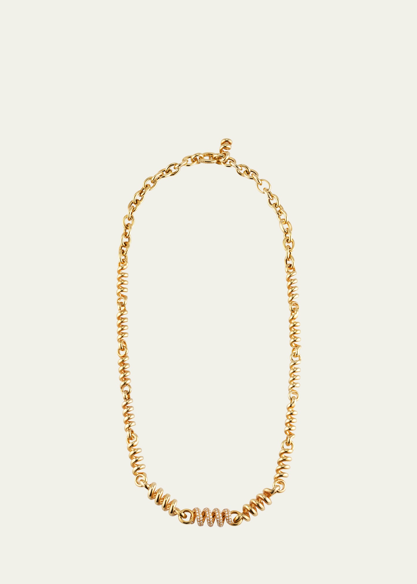 Boochier necklace with coiled stations Approx. 16" length 18-karat yellow gold Front and center coil with diamonds Total carat weight: 0.7 Hinged clasp Imported
