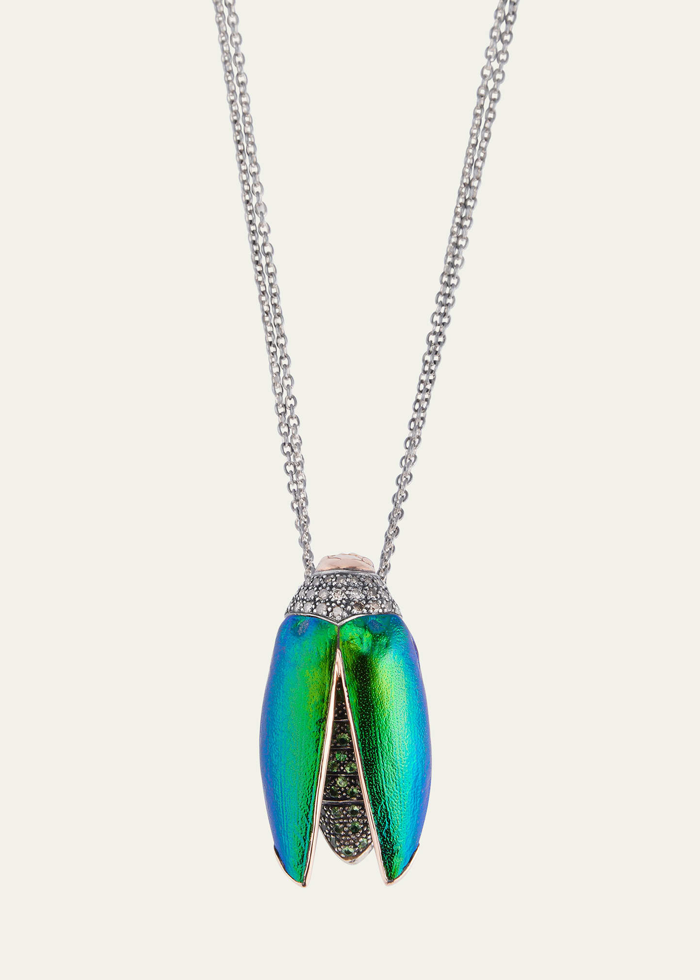 Bibi van der Velden necklace 18-karat yellow gold and sterling silver Real scarab wings Fancy Sapphires 0.235 total sapphire carat weight Approx. 28"L ; adjustable length Imported