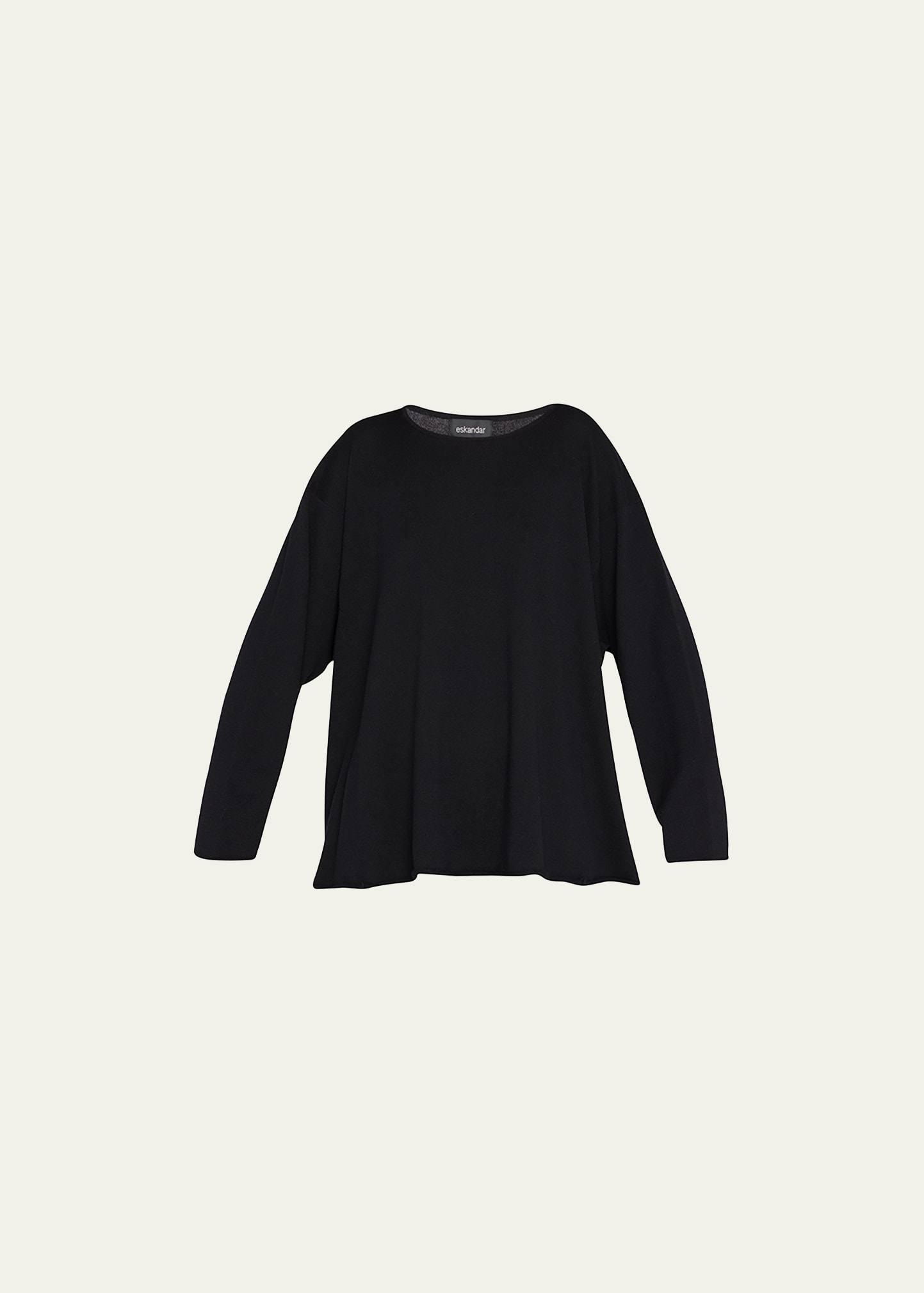 Eskandar 2-ply knit sweater with side paneling detail Bateau neckline Long sleeves; drop shoulders A-line silhouette Mid plus length Roll edge trim Pullover style Cashmere Made in United Kingdom