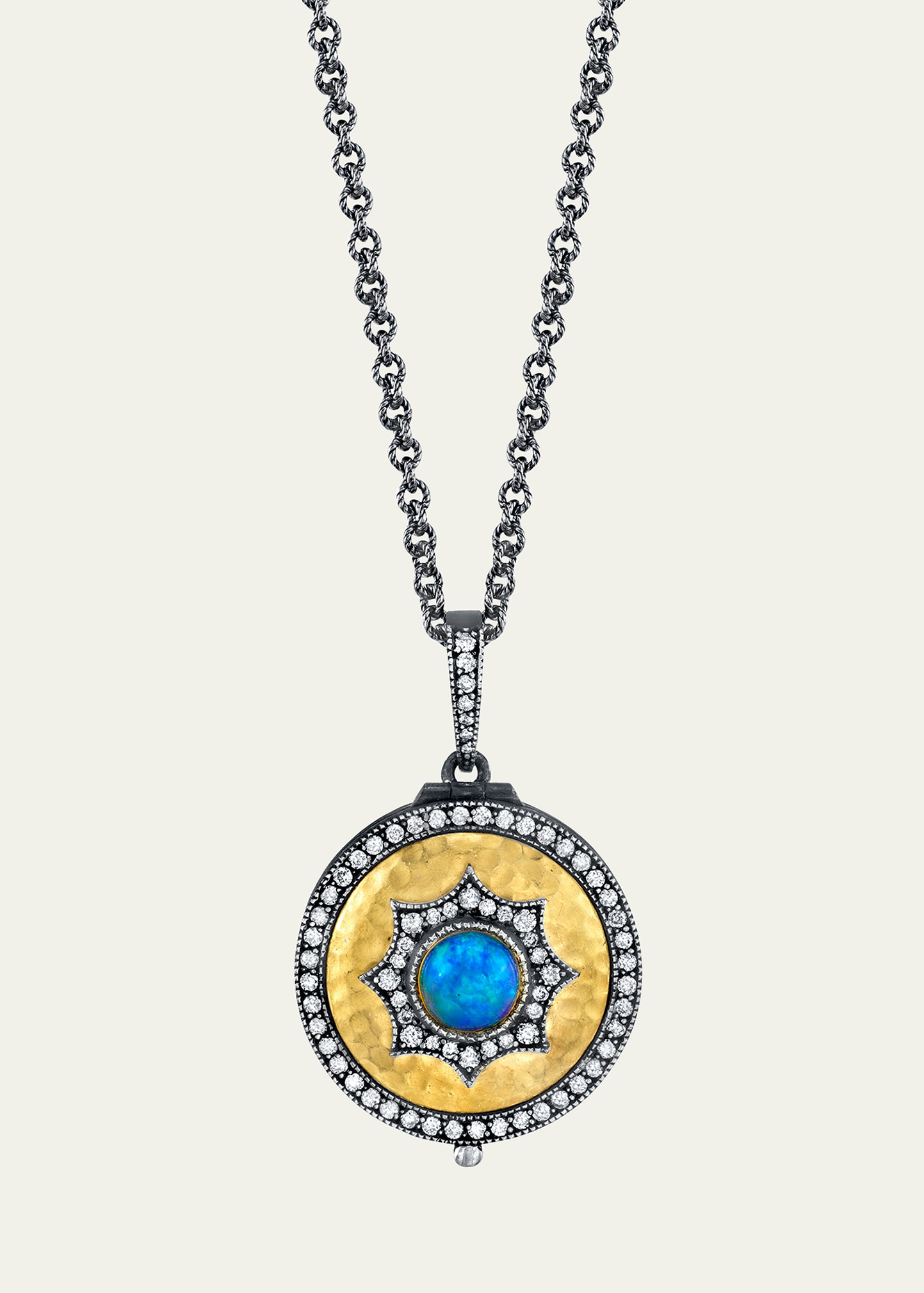 Arman Sarkisyan necklace Necklace length: approx. 18 inches Round locket in 22-karat yellow gold Oxidized silver chain, bail and trim Bezel-set round blue opal at center Diamond pavé bail and halos Opal total carat weight: 0.90 Diamond total carat weight: 0.70 Adjustable length Jump ring Made in the USA