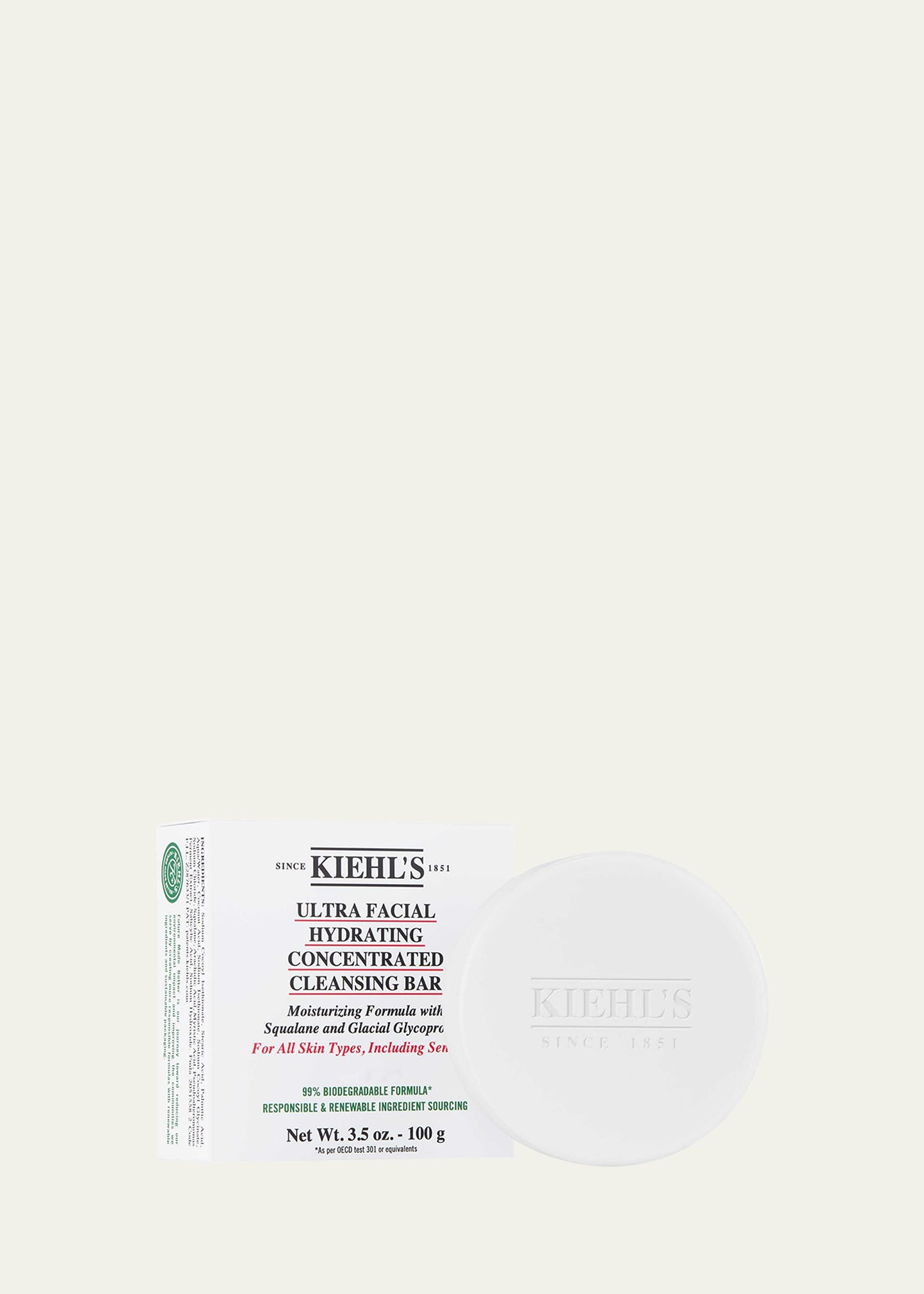 Formulated without Soap, Fragrance, and Mineral Oil Renewable Squalane and responsibly sourced Glacial Glycoprotein Formulated with 5x less water than traditional facial cleansers* Minimal paper packaging** 99% biodegradable formula*** *Compared to formula composition of Kiehl's liquid facial cleanser **FSC certified carton ***As per OECD test 301 or equivalents How to Use: Under warm water, wet hydrating facial cleansing bar and lather between hands until it starts to foam Gently mass.