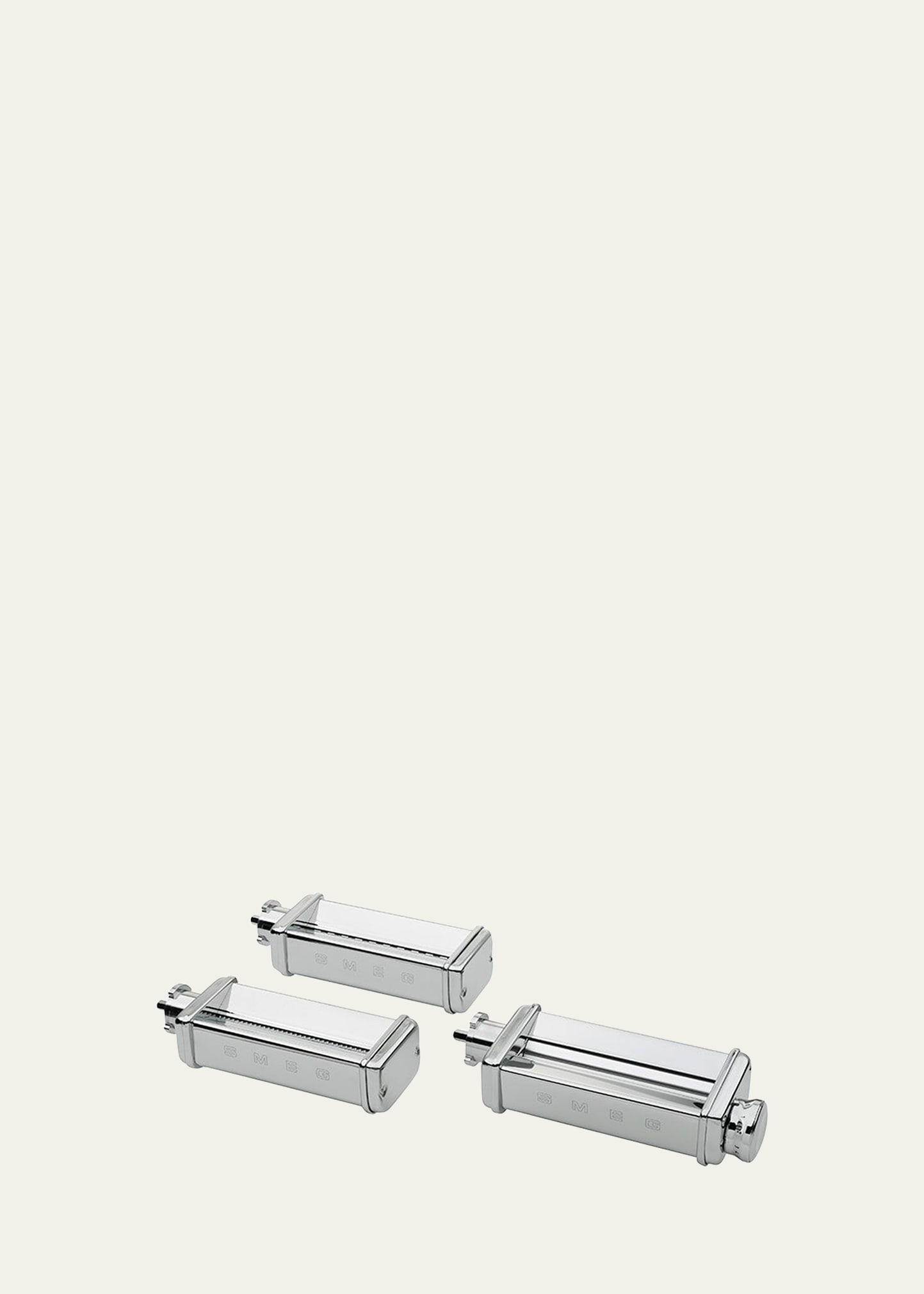 Pasta roller and pasta cutter accessories compatible with the Smeg Stand Mixer Includes: Pasta roller, tagliolini cutter, and fettuccine cutter Made of metal Item Weight (Lbs.): 8.5 Wipe clean Imported