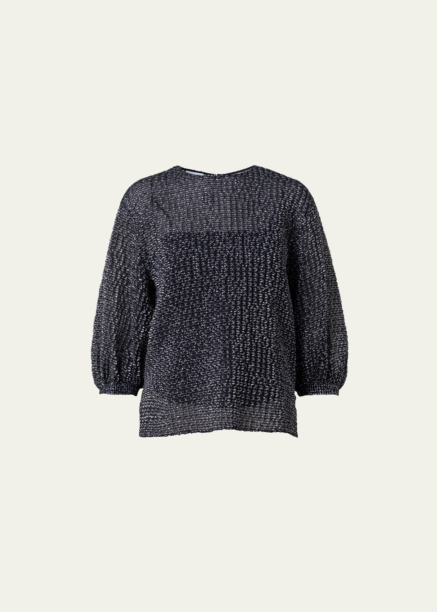 Akris punto organza blouse decorated with allover 3D metallic accents Round neckline Bracelet sleeves Dropped shoulders Side slits Boxy fit Elongated back hem Back zip closure Viscose/nylon/polyamide Made in Romania