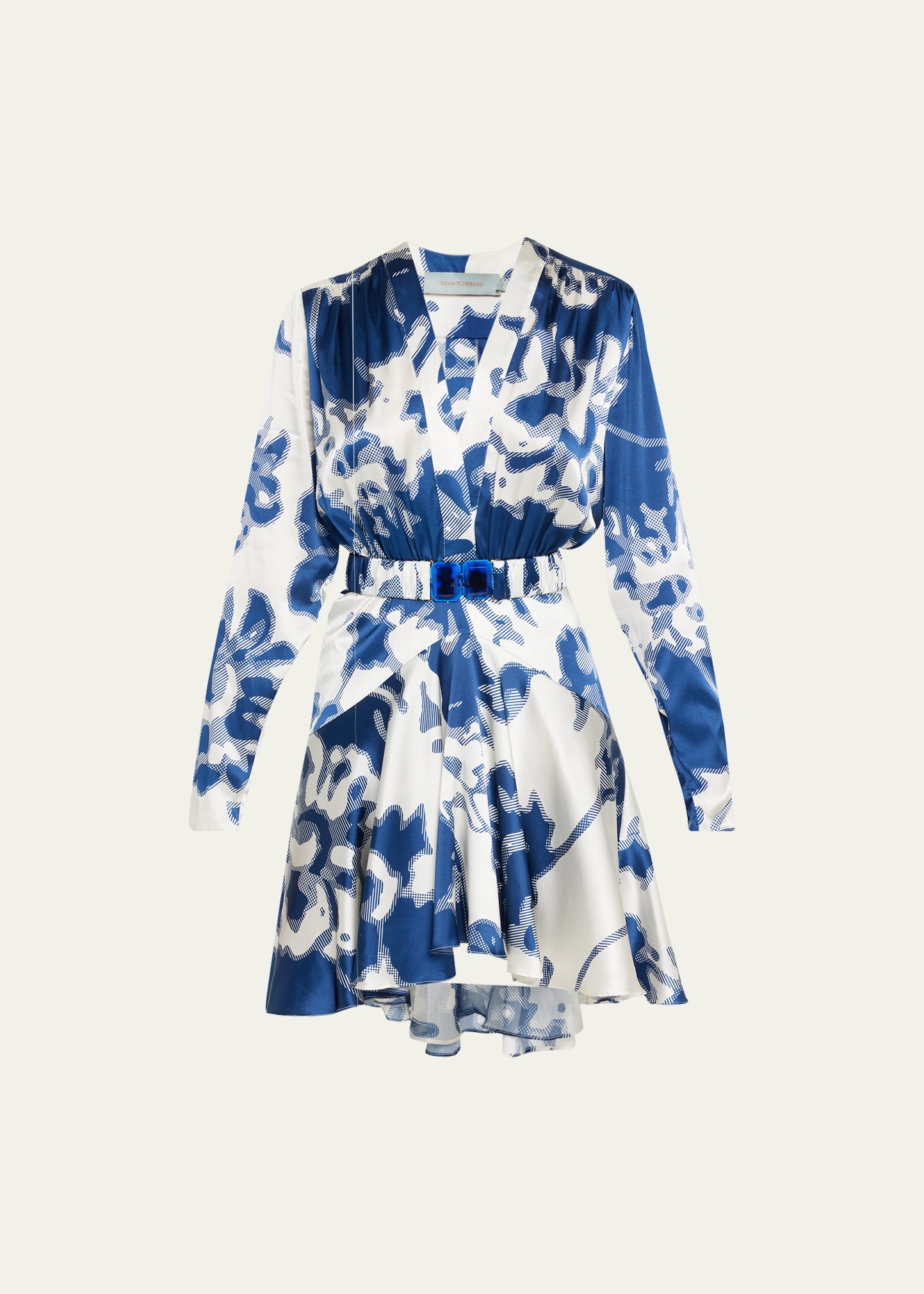 Silvia Tcherassi "Aglioni" satin printed dress with a tonal belt Plunging V neckline Long sleeves Back yoke Belted waist Fit-and-flare silhouette Short length High-low hem Silk Made in Colombia