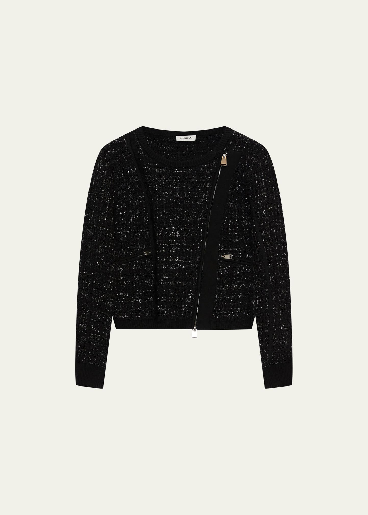 SIMKHAI "Alameda" bouclé jacket with coordinating ribbed trim Approx. 20"L from shoulder to hem Crew neckline; asymmetric zip front Long sleeves; zip cuffs Front zip pockets Relaxed fit Hip length Polyester/merino wool/nylon Dry clean Imported