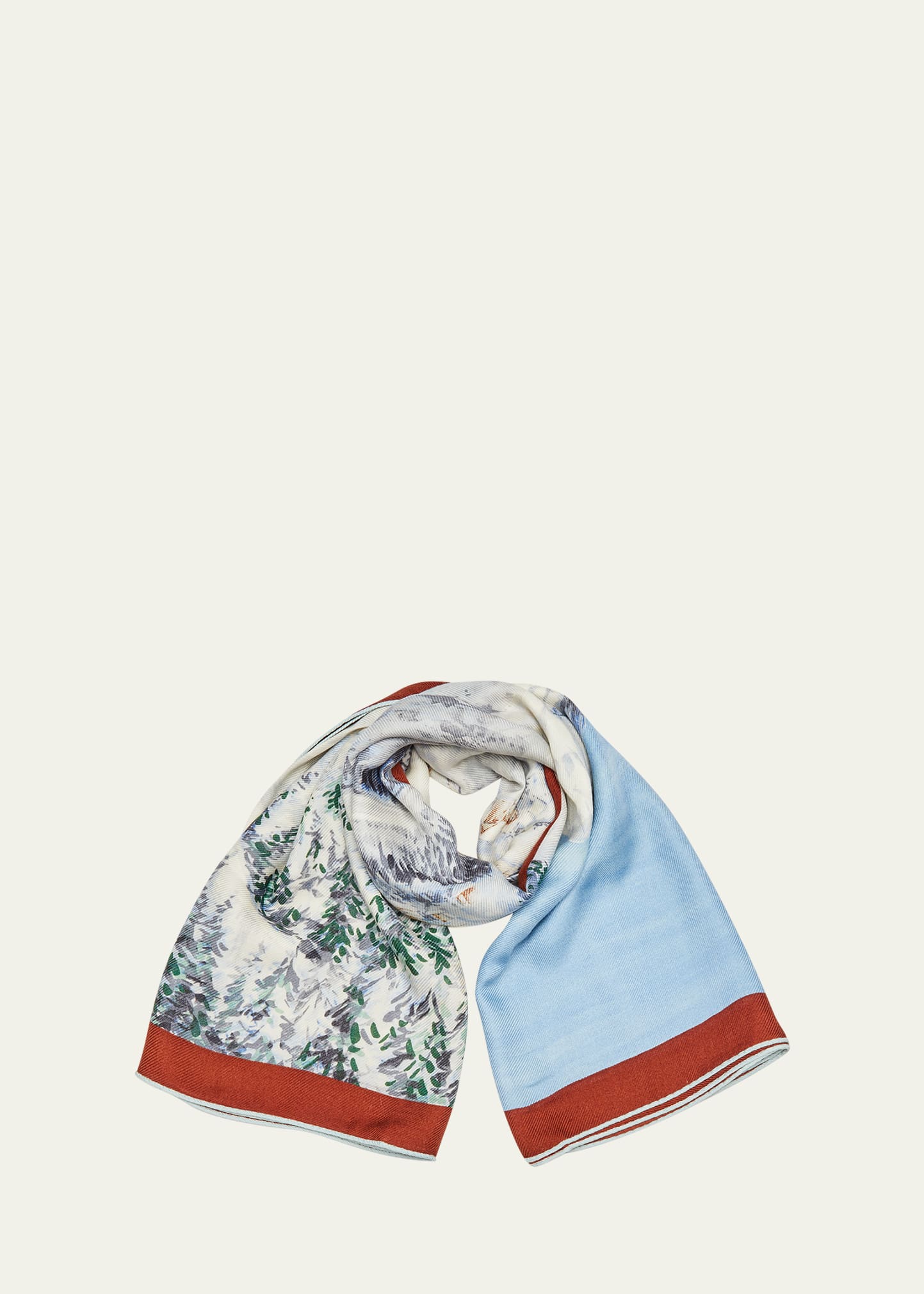 Loro Piana scarf in cashmere and silk Features a motif of the alps with a contrasting trim Signature logo accent May be styled multiple ways Dry clean Made in Italy
