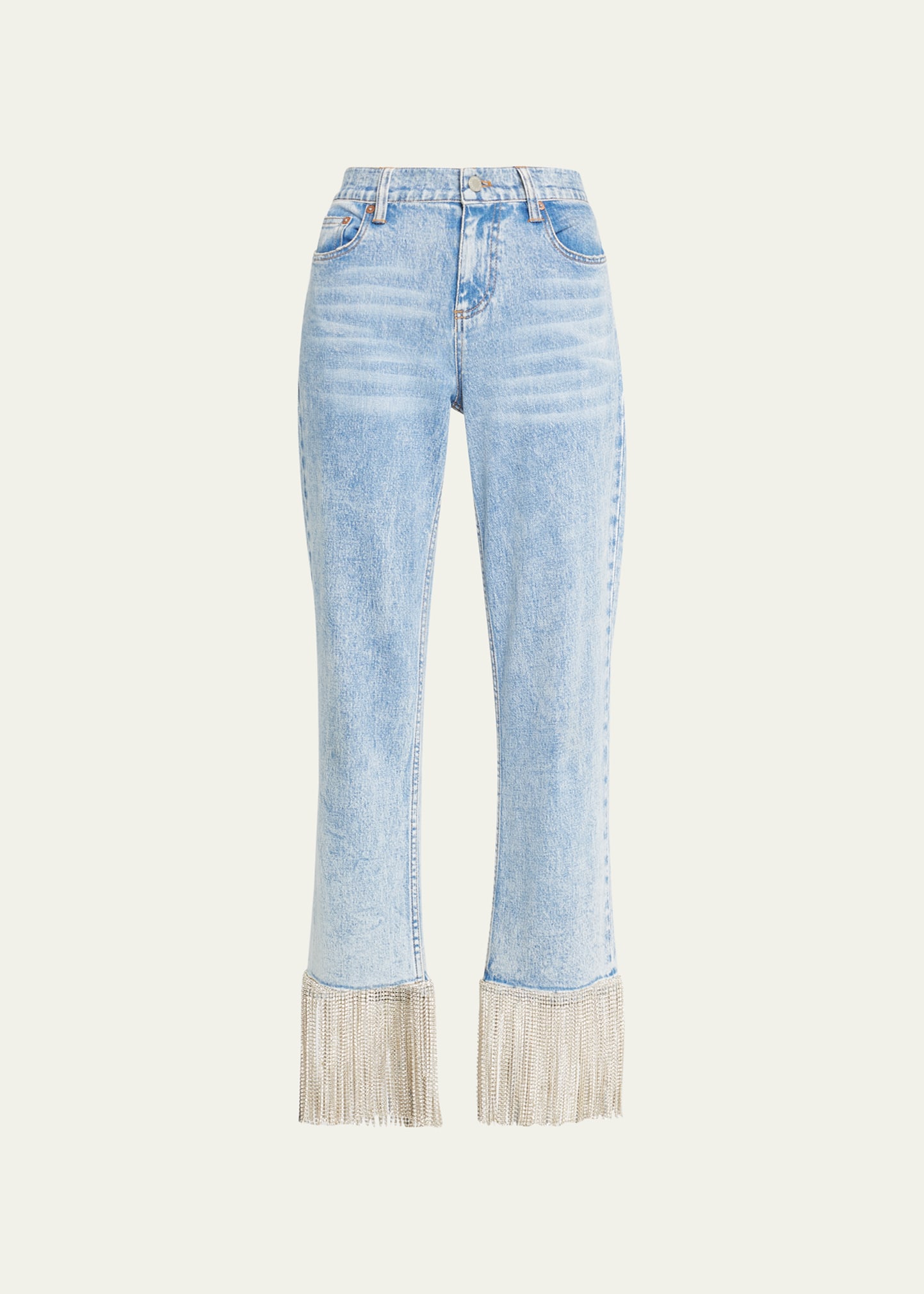 Alice + Olivia "Amazing" boyfriend jeans embellished with crystal fringe trim Five-pocket style High rise Flat front Full length Straight legs Button/zip fly; belt loops Cotton/elastane Lining: Polyester/cotton Dry clean Made in Italy