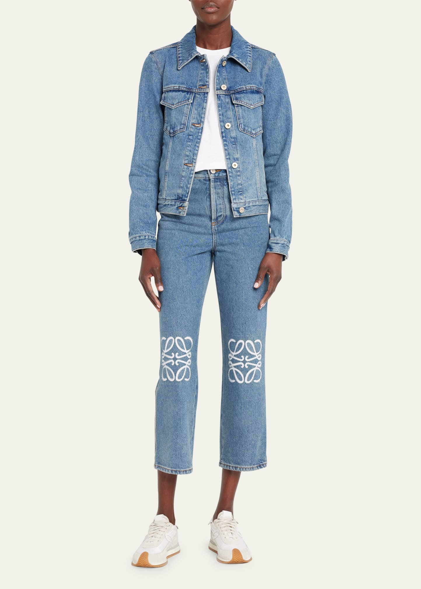Loewe "Anagram" denim jacket in a classic styling Point collar Button front Long sleeves Side slip pockets Mid-length Relaxed fit Cotton/calf leather/polyester Made in Italy