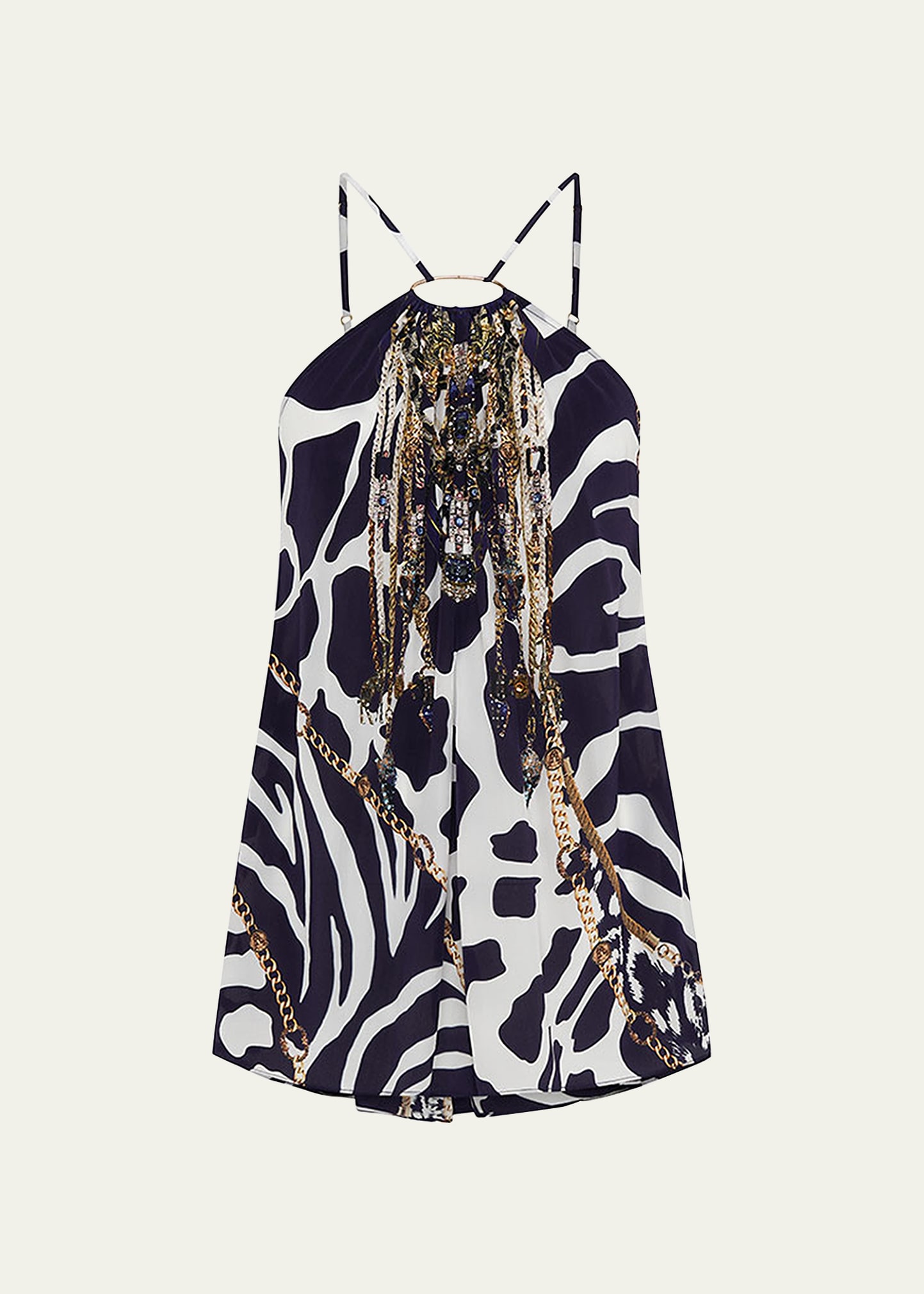 Camilla top features a botanical giraffe print embellished with crystals Gathered halter neckline Adjustable straps Open shoulders Relaxed fit Curved hem Slip-on style Silk Imported