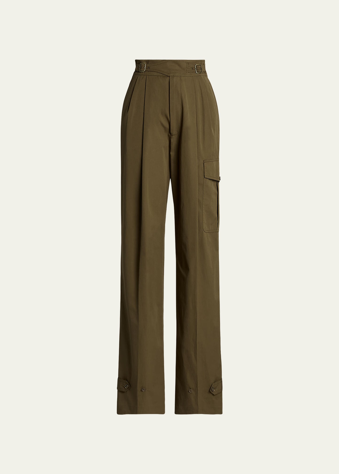 Ralph Lauren Collection "Anniston" pants with pleated front High rise Side slip pockets; back flap-buttoned pockets Thigh flap-buttoned pocket Adjustable side buckles Straight legs Full length Belted cuffs Zip fly Cotton Made in Italy