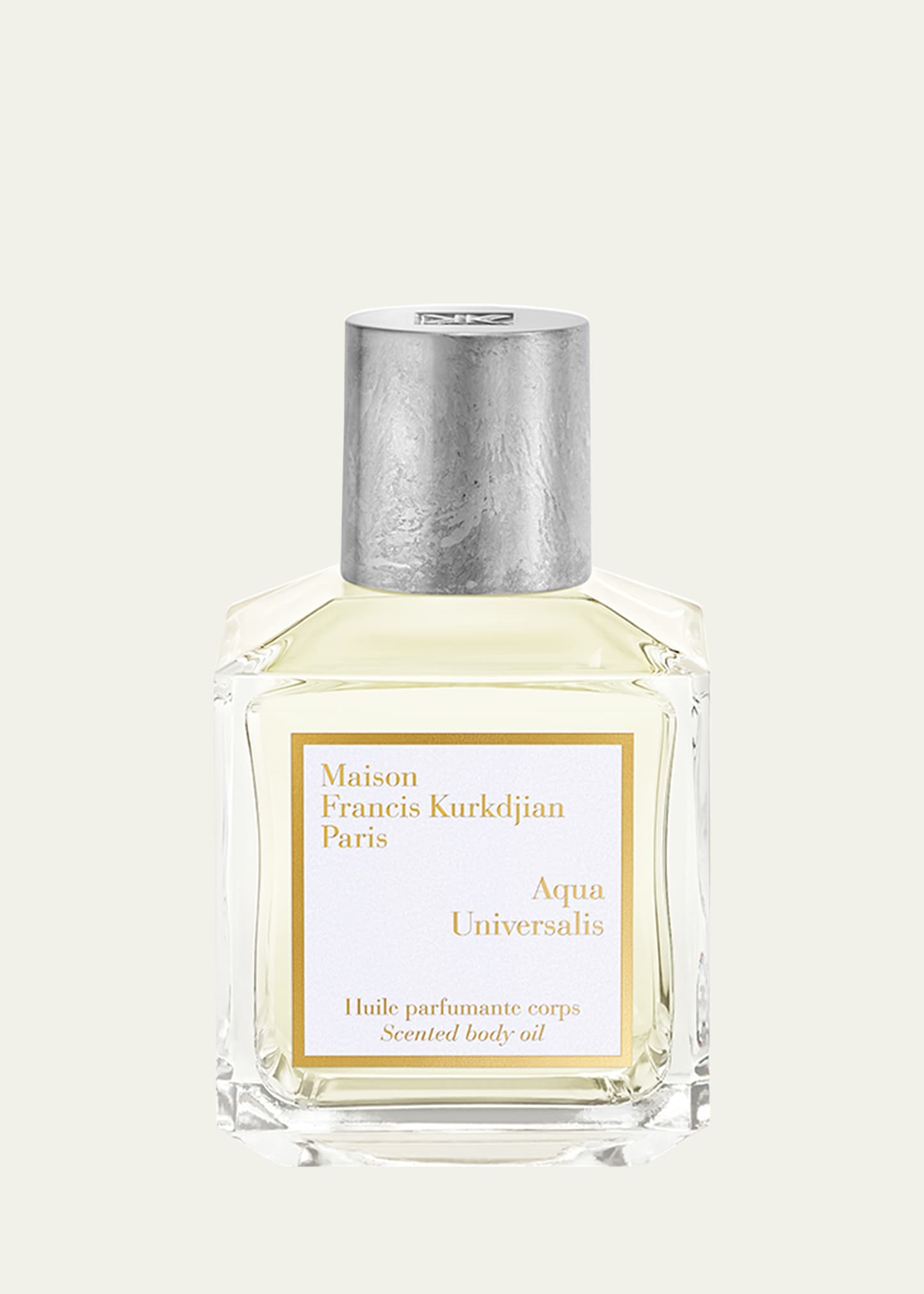 Maison Francis Kurkdjian Aqua Universalis Scented Body Oil, 2.4 oz. The Aqua Universalis scented body oil exalts the skin with an exquisite, sensual veil. Its light, non-greasy, irresistible texture is rapidly absorbed, leaving the skin satiny smooth, and delicately scented. It blends three oils selected for their natural properties: argan oil known for its revitalizing and antioxidizing properties, sweet almond oil known for its softening and regenerating abilities, and apricot kernel oil kn.