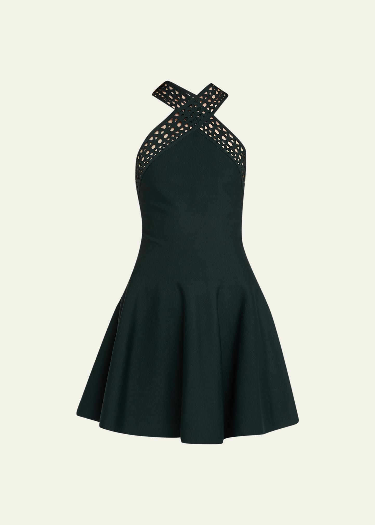ALAIA "Vienne" mini skater dress features an open-knit halter neckline Halter neckline Sleeveless Concealed side zip closure Hem falls above the knee A-line silhouette Viscose/polyester Dry clean Made in Italy