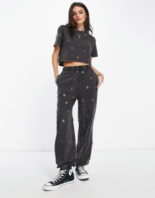 ASOS DESIGN all over eyelet sweatpants in washed charcoal - part of a set-Gray