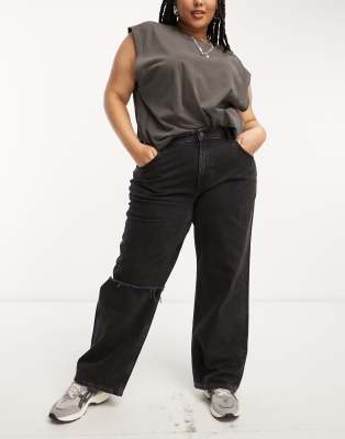 ASOS DESIGN Curve baggy boyfriend jean in washed black with knee rips
