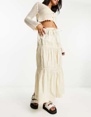 ASOS DESIGN dropped waist midi skirt with gathered seam detail in stone-Neutral