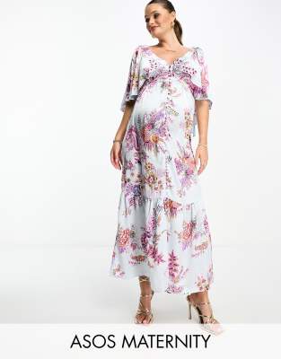 ASOS DESIGN Maternity satin flutter sleeve v-neck maxi dress with tier hem in paisley print-Multi