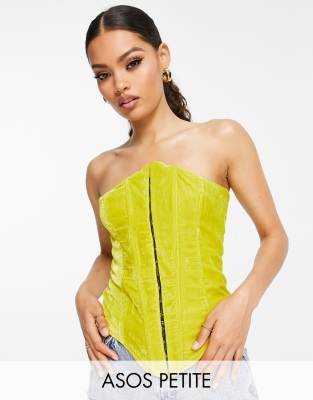 ASOS DESIGN Petite bandeau corset with hook & eye in chartreuse velvet-Green
