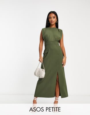 ASOS DESIGN Petite blouson sleeveless midi dress with pocket and split detail in khaki-Green