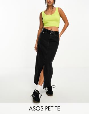 ASOS DESIGN Petite denim midi skirt with split hem in washed black