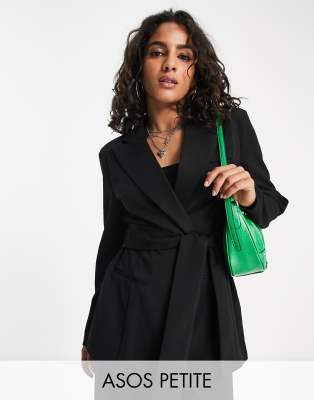 Petite dress by ASOS DESIGN Work-to-weekend vibes Notch lapels Padded shoulders Wrap front Tie waist Regular fit