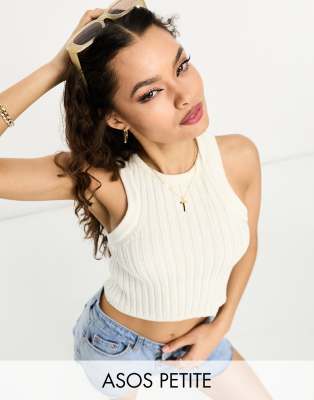 ASOS DESIGN Petite knitted crop racer tank top in chunky stitch in cream-White