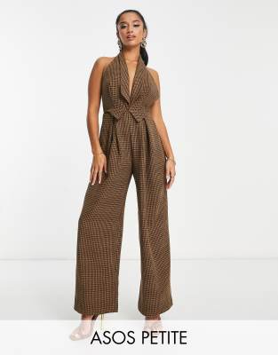 ASOS DESIGN Petite tailored plunge halter jumpsuit in brown plaid print-Multi
