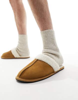 ASOS DESIGN premium sheepskin slippers in tan with teddy lining-Brown