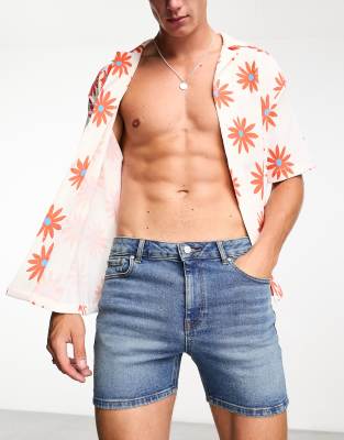 ASOS DESIGN skinny shorter length denim shorts in mid wash blue-Blues