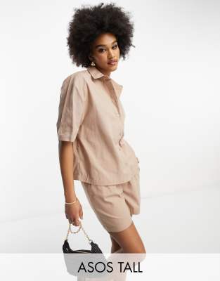 ASOS DESIGN Tall boxy shirt with linen in taupe - part of a set-Brown