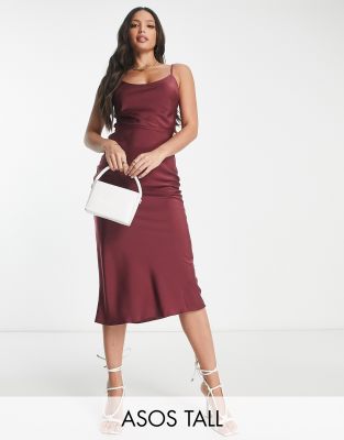 ASOS DESIGN Tall scoop neck satin midi slip dress with tie waist detail in berry-Red