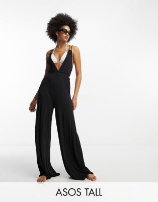 Jumpsuits & Rompers by ASOS Tall In association with sunny days Plunge neck Fixed straps Elastic waist Wide leg Regular fit