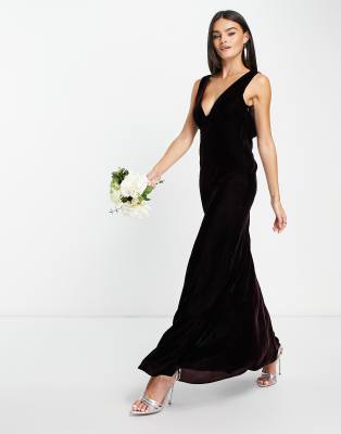 ASOS DESIGN velvet ruched bodice maxi with drape cowl back in wine-Red