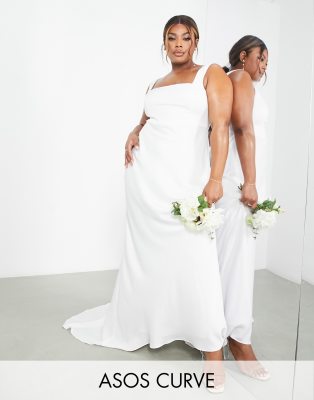 ASOS EDITION Curve Layne satin square neck wedding dress with train in ivory-White