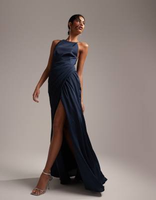 ASOS EDITION satin square neck maxi dress with side split in petrol blue-Navy