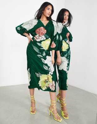 ASOS EDITION velvet wrap midi dress in large bloom floral embroidery in green