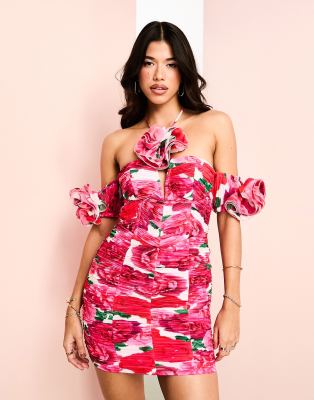ASOS LUXE halter ruched mini dress with corset bodice & corsage detail in rose print-Pink