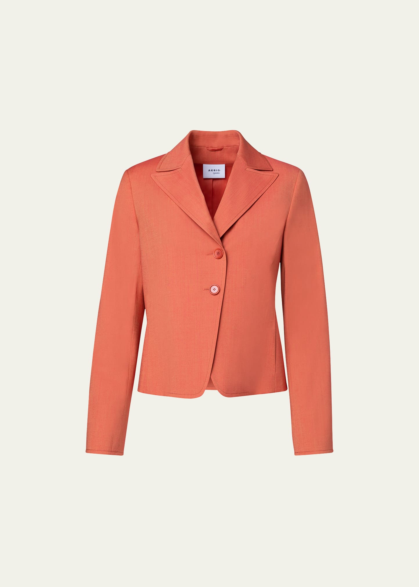 Akris punto wool blend blazer jacket with an asymmetrical front styling Peak lapel collar Button front Long sleeves Side seam pockets Boxy fit Half lined Virgin wool/viscose/spandex Lining: Cupro Made in Romania