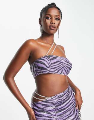 ASYOU ICONICS sequin chain detail crop top in purple zebra print - part of a set-Multi