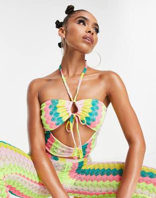 ASYOU ruched halter neck cut out stripe crochet cami top in multi - part of a set