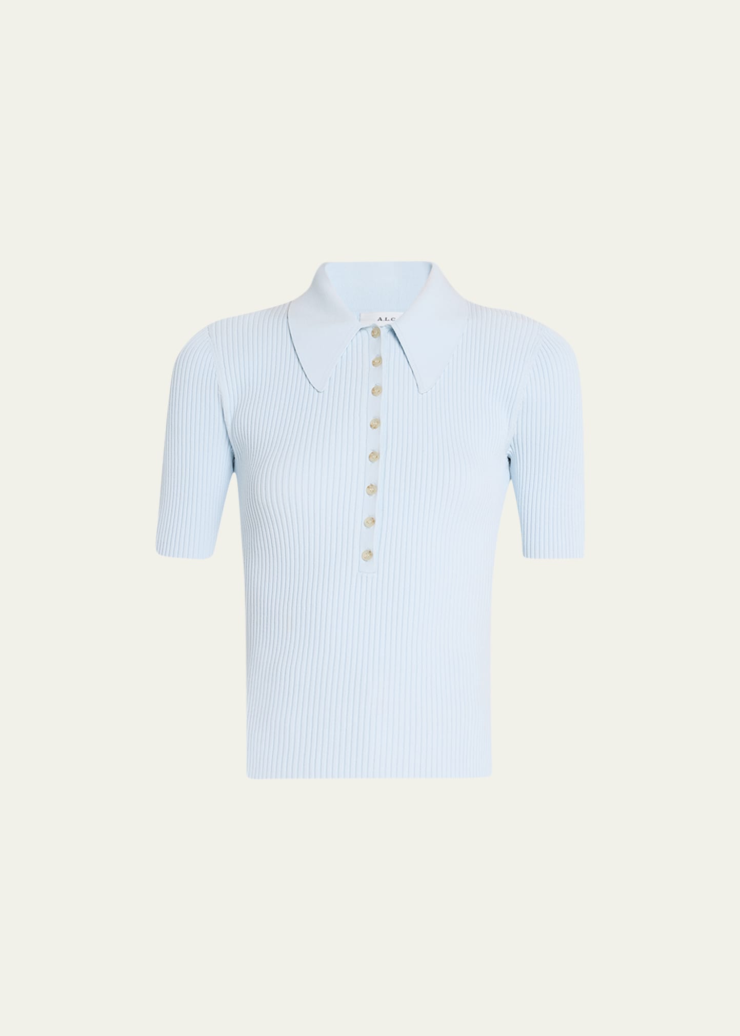 A.L.C. "Atlas" polo top in a ribbed knit construction Approx. 21.5"L from shoulder to hem Point collar; half-button front Short sleeves Slim fit Pullover style Viscose/polyester Dry clean Imported