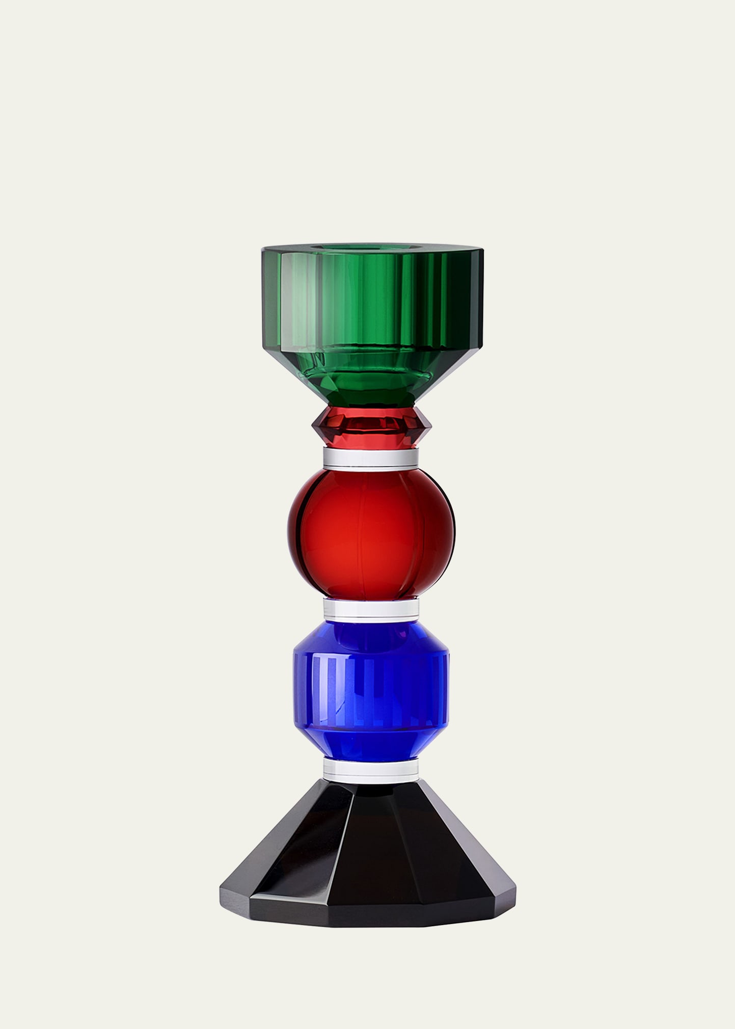 This gemlike candle holder captivates anyone that looks at it with its riot of color combinations - emerald, green, sapphire blue, onyx, and amber. This sharp and sparkling hand-cut crystal candle holder is incredibly captivating and will stand sharp on a white tablecloth alone or create a riot of colors by combining it with all four candle holders from the collection. Approx. 1"L x 3.2"W x 5.9"T Wipe clean Item Weight (Lbs.): 2.0 Imported