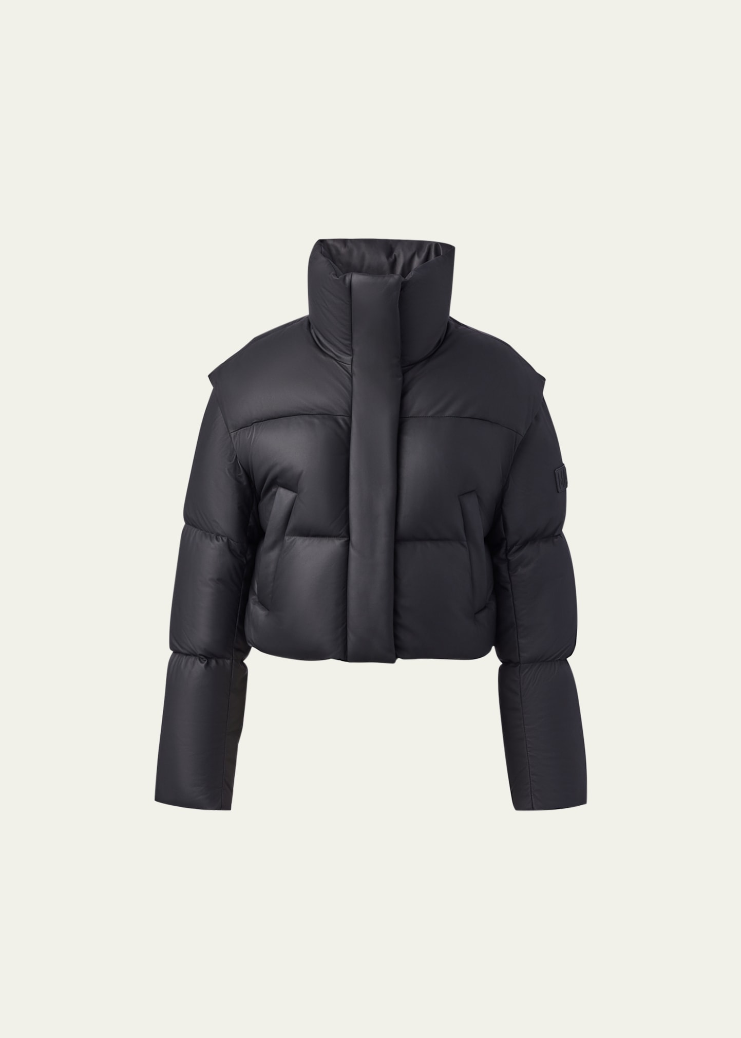Mackage "Bailey" convertible down puffer jacket in sheep leather featuring removable sleeves Approx. 19.75"L from shoulder to hem Stand collar Zip front; snap placket covered Long sleeves; logo patch at left Zippered welt pockets Adjustable drawcord hem; cropped Relaxed fit Sheep leather/skin 800+ traceable duck down Lining: Nylon Water repellent Imported