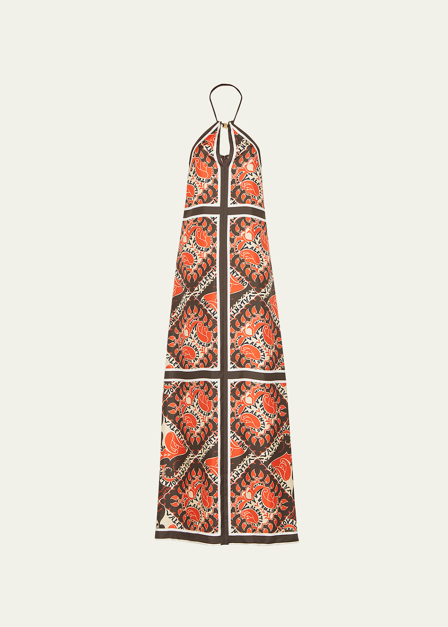 Valentino gown in paisley bandana print Halter neckline; self-tie at nape Keyhole front Sleeveless A-line silhouette Full length Silk Made in Italy