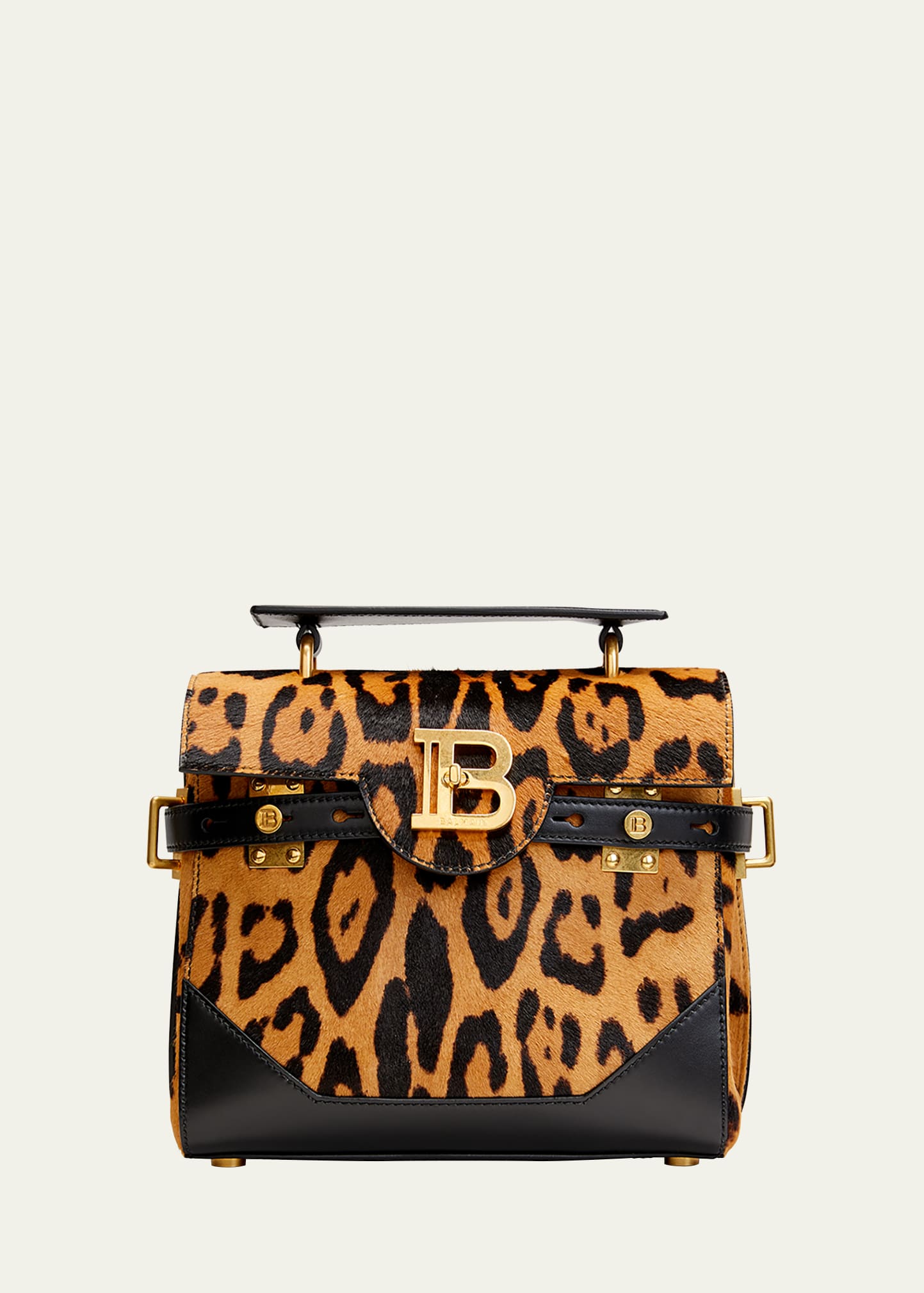 Balmain crossbody bag in calf leather and leopard pattern dyed calf hair (Italy) Flap top handle anchored by metal rings Removable, adjustable crossbody strap Can be worn as a top handle or crossbody/shoulder bag Flap top with logo "B" turn-lock closure Belted exterior secures at adjustable tab front Feet protect bottom of bag Approx. 7.8"H x 9"W x 4.3"D "BBuzz 23" is made in Italy