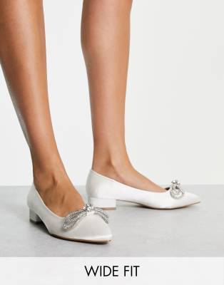 Be Mine Wide Fit Bridal Acadia bow front flat shoes in ivory satin-White