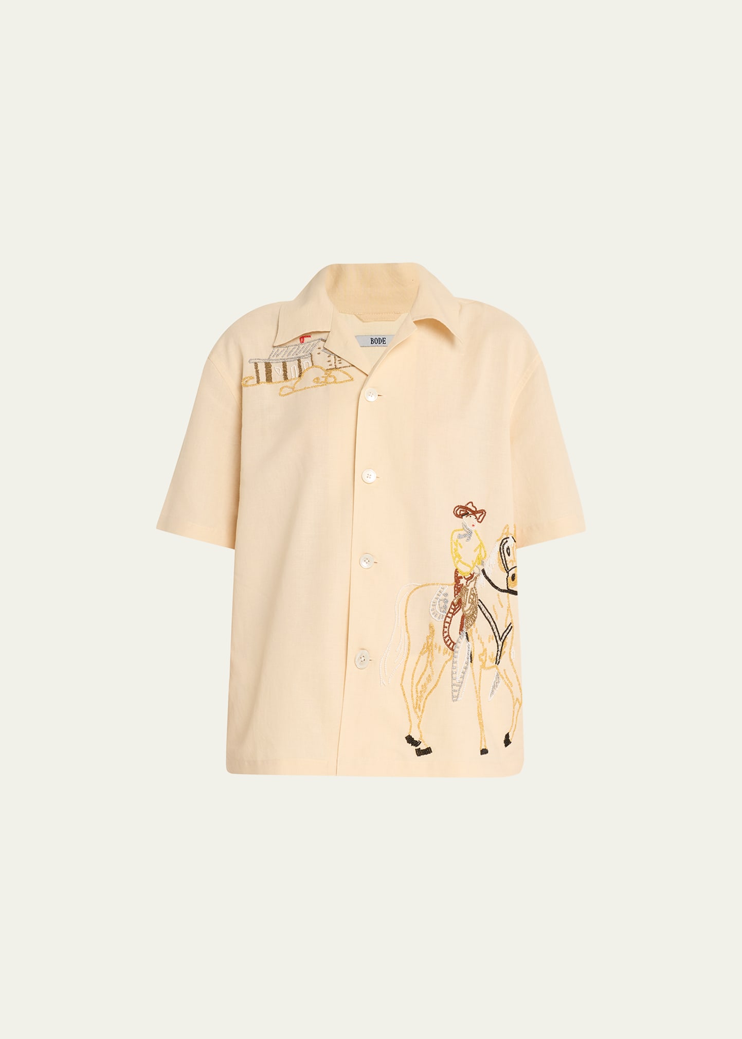 Bode shirt with beaded buckaroo detail Camp collar; button front Short sleeves Boxy fit Linen/cotton Dry clean Imported