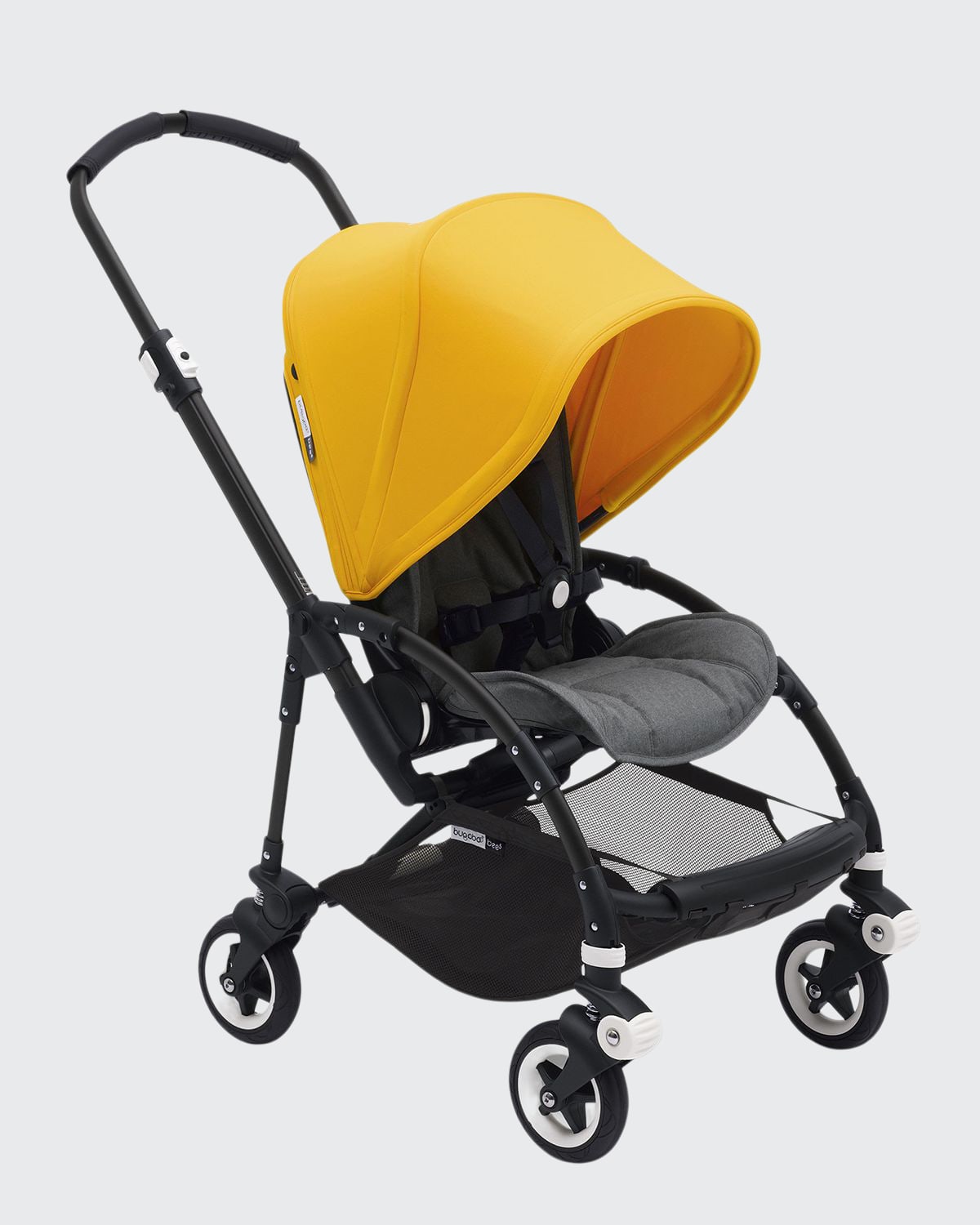 Bugaboo Bee Complete Stroller will feature: Aluminum chassis with four-wheel suspension; durable, foam-filled 6" rubber wheels. Faux leather (polyurethane) carry handle and height-adjustable handle bar. Large, water-repellant UPF 50+ sun canopy with wires and clamps; rain cover. Reversible, extendable seat with three reclining positions; car seat compatible. Five-point harness with height-adjustable shoulder straps. Under-seat basket holds a maximum weight of 8.8 lbs. Product dimensions (fold.